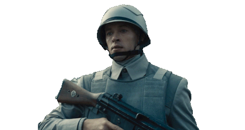 Coriolanus Snow (Tom Blyth) looking nervous and tense in his military uniform, holding a rifle from The Hunger Games.