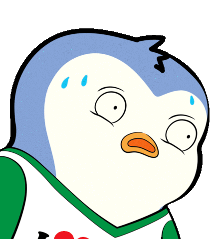 Pudgy Penguin looks wide-eyed and nervous, with a bead of sweat on its head, conveying anxiety.