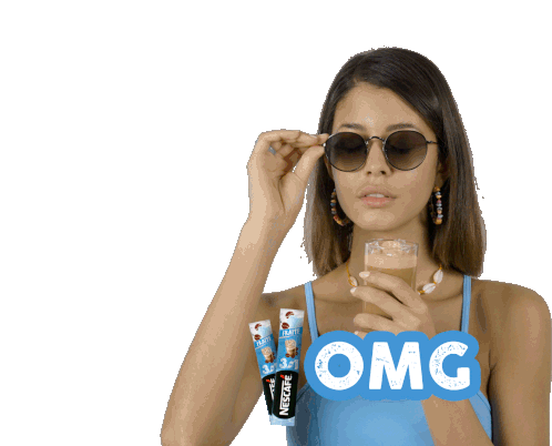 A woman in sunglasses reacts with 'OMG' while holding a Nescafé 3in1 Frappe, showing surprise and delight.