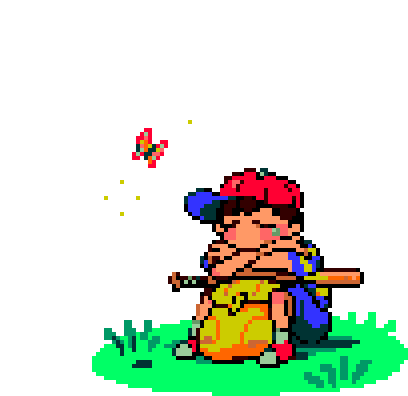 Ness from Earthbound is seen peacefully asleep on the grass, accompanied by a fluttering butterfly.