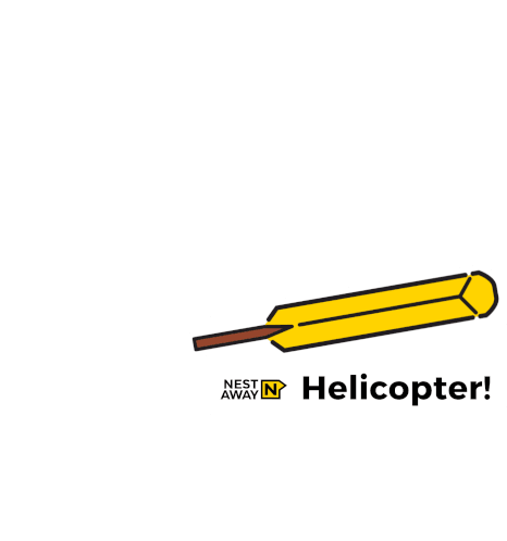 A stylized Nestaway cricket bat spins like a helicopter, accompanied by the text 'Helicopter!'. Perfect for cricket fans.