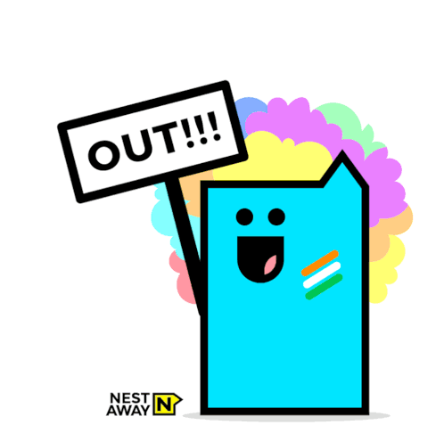 An excited Nestaway character with an Indian flag on its cheek cheers 'OUT!!!' for a cricket Worldcup moment, celebrating a wicket.