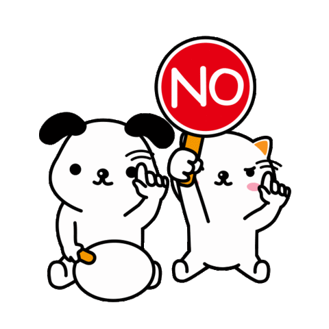 A cute cartoon dog holds a red 'NO' sign while a cat makes a finger gesture, both expressing refusal or disagreement.