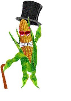 A dapper ear of corn from New Corn Order Corn Site dances, wearing a top hat, sunglasses, and bow tie.