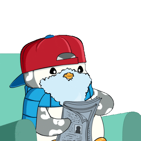 Pudgy Penguin relaxing in a chair, sipping coffee and engrossed in reading the daily newspaper.