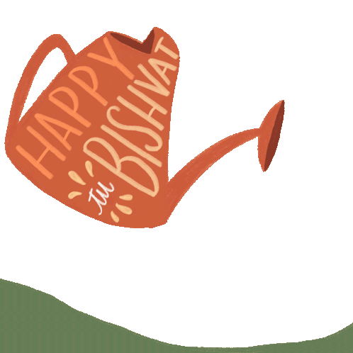 A watering can wishes 'Happy Tu Bishvat' as it waters the ground, causing heart-shaped flowers to bloom.