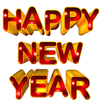 A festive animated sticker featuring a dancing Santa Claus and shiny 3D text wishing a Happy New Year.