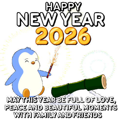 a happy new year 2026 greeting card with a penguin and a bottle of champagne