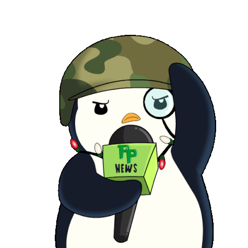A Pudgy Penguin, dressed as a news reporter in a military helmet, delivers breaking news with a serious expression.