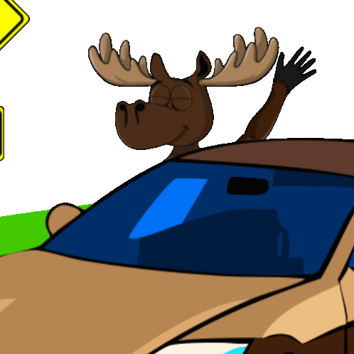A happy cartoon moose enjoys a car ride with its head out the window, waving. An Nft Blockchain sticker.