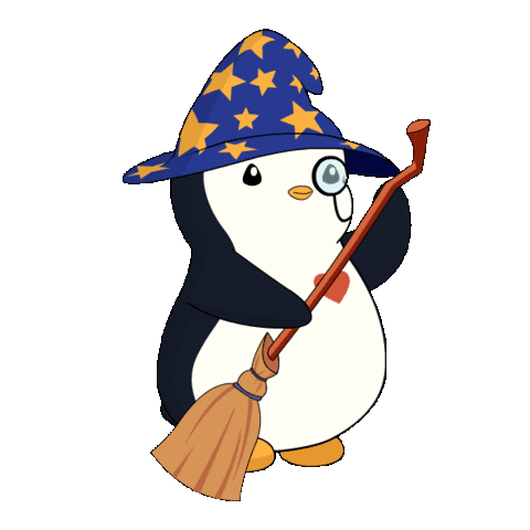 A charming cartoon penguin dressed as a witch or wizard, complete with a star-spangled hat and monocle, holds a magical broom.