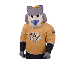 An NHL mascot, wearing a Nashville Predators jersey, flexes its arm and points, showing strength and enthusiasm.