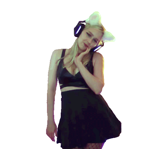 a woman wearing a black dress and headphones with cat ears on her head