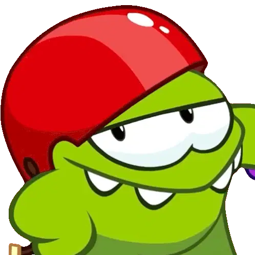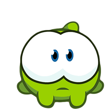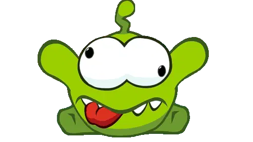 An excited Nibble Nom character, a green cartoon creature with big blue eyes, bobs happily.