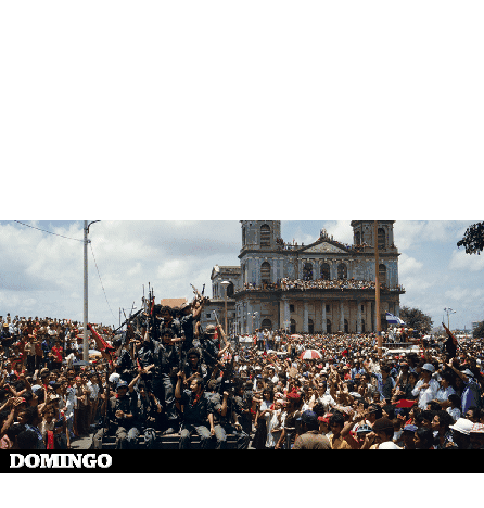 Daniel Ortega at a massive FSLN rally in Nicaragua, celebrating with supporters and national symbols.