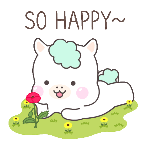 A cute white cartoon animal lies happily in a field of flowers with the text 'SO HAPPY~' above it.