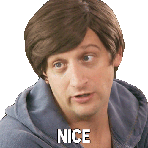 Tim Robinson, wearing a wig and hoodie, says 'Nice' with a pleased and approving expression.