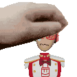A hand playfully holds the Nickzvr character's head over another Rec Room character, creating a fun, interactive moment.