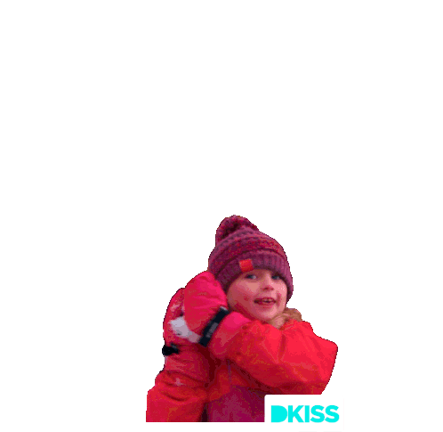 A happy child in a red winter coat and mittens raises her arms excitedly, with "DKISS" visible.