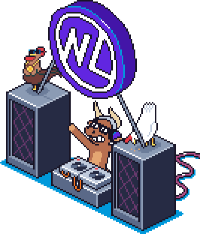 Pixel art DJ bull character with headphones mixing music at a Nifty League Nifty Smashers party with chickens.