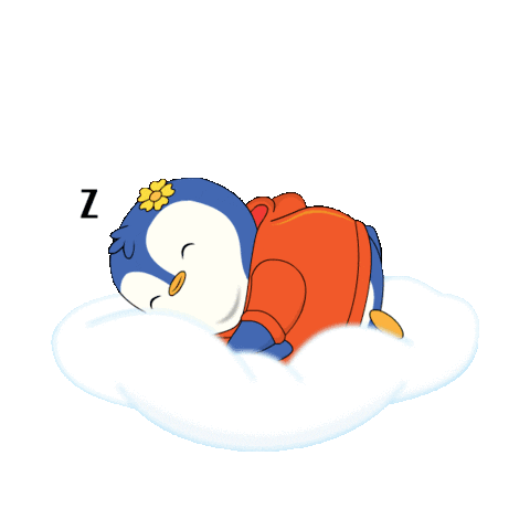 A cute penguin character, wearing an orange top and a flower, sleeps soundly on a soft white cloud, indicating sweet dreams.