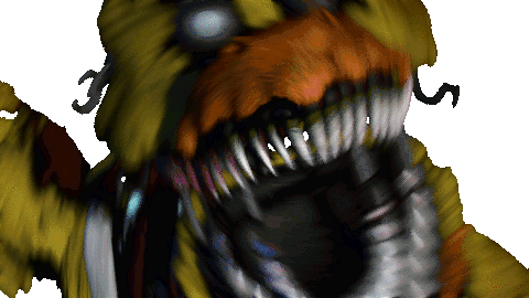 Nightmare Chica from Fnaf performs a terrifying jumpscare, appearing as a blurry, yellow animatronic.