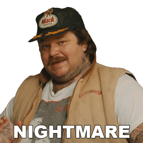 Matty Matheson, wearing a Mack Trucks hat, looks at the camera with a gesture, displaying the word 'NIGHTMARE'.
