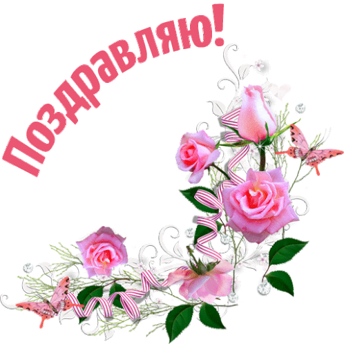 pink roses are surrounded by green leaves and ribbons and the words поздравляю in red