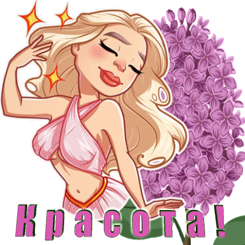 a cartoon of a woman with purple flowers and the words kpacota in pink letters
