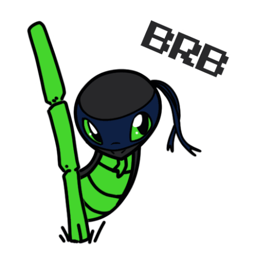 Ninja Sneki, a cute green worm-like character, holds a bamboo stalk with 'BRB' text above.