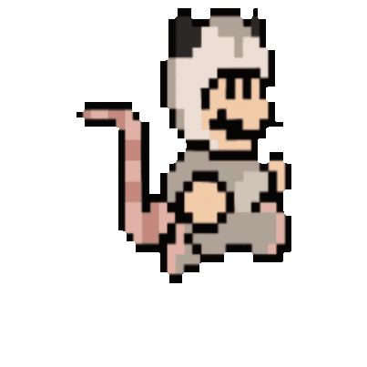 Pixel art of Nintendo's Super Mario Bros. character Mario, wearing a unique rat-like suit with a long tail.