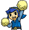Link from The Legend of Zelda: Tri Force Heroes enthusiastically cheers with blue pom-poms, showing excitement.