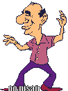 Nisan Mistya, a cartoon man in a pink shirt, is dancing with energetic movements, expressing a cheerful and animated mood.