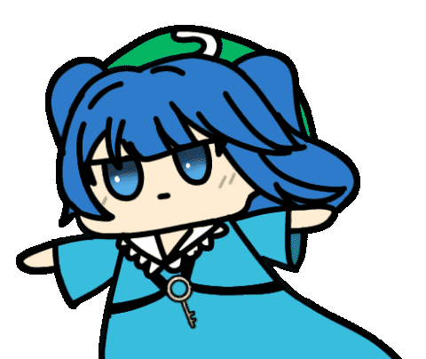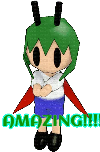 a drawing of a girl with blue hair and a green hat with the letter s on it