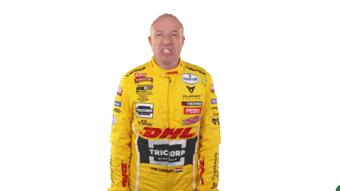 Tom Coronel, the racing driver, shows intense anger, clenching his fists in his yellow DHL suit.