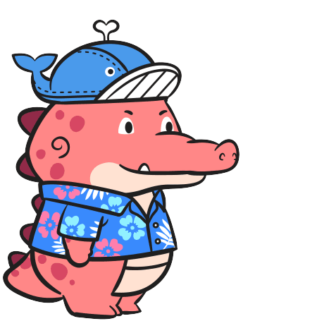 Cute cartoon baby alligator wearing a whale hat and Hawaiian shirt, emphatically saying 'NO'.