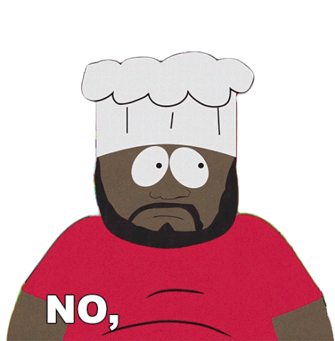 Chef from South Park emphatically says "No, no, no!" with a worried expression, shaking his hands in refusal.