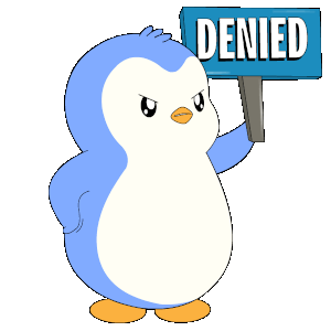 A cute Pudgy Penguin shakes its head while holding a sign that clearly states "DENIED", expressing disagreement.