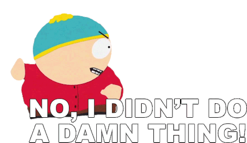 Eric Cartman from South Park emphatically denies responsibility, stating "No, I didn't do a damn thing!" with an angry expression.