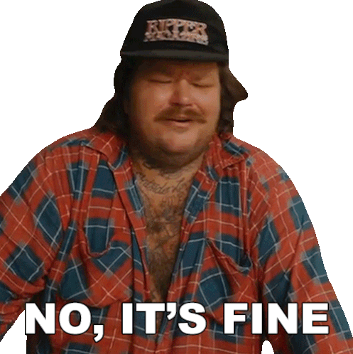Matty Matheson, wearing a plaid shirt and hat, makes a resigned face with the caption 'NO, IT'S FINE'.