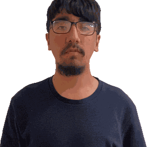 a man with glasses and a beard is looking at the camera with his eyes closed