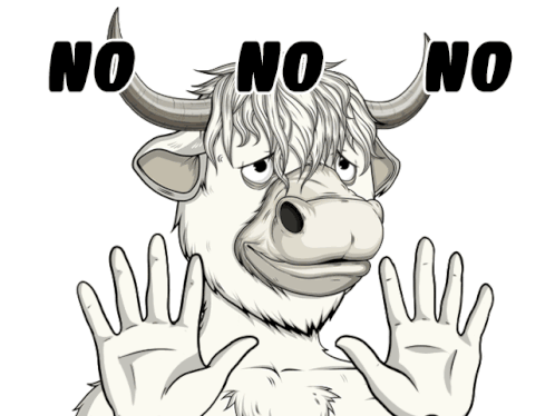 A cartoon bull from Two3 Labs shakes its head, emphatically saying 'No No No' with text on its forehead.
