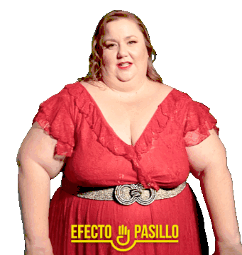 A woman in a red dress screams in this animated sticker for 'No No Te Enamores' by Efecto Pasillo, featuring Paula Cendejas.