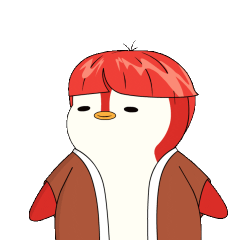 A Pudgy Penguin character with a red bowl cut shakes its head side to side, indicating "no" or "nope."