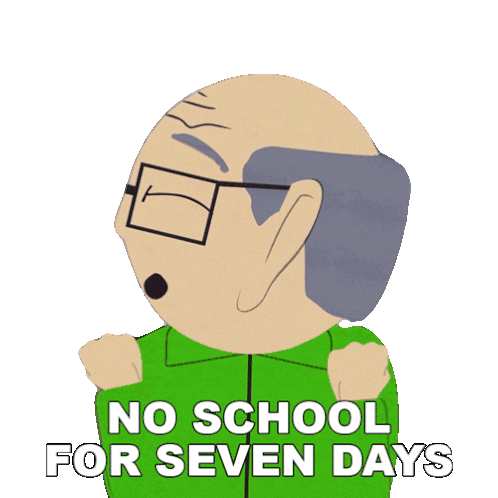 Herbert Garrison from South Park reacts with joy and then surprise to the news of no school for seven days, celebrating a week-long break.