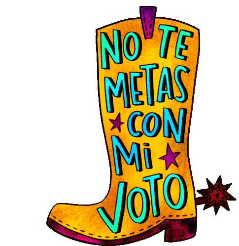 A vibrant yellow cowboy boot sticker with the Spanish phrase 'No Te Metas Con Mi Voto' (Don't Mess With My Vote) in blue text, advocating for voting rights.