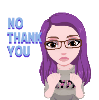 An animated girl with purple hair and glasses gestures "no" while the text "NO THANK YOU" appears, expressing polite refusal.