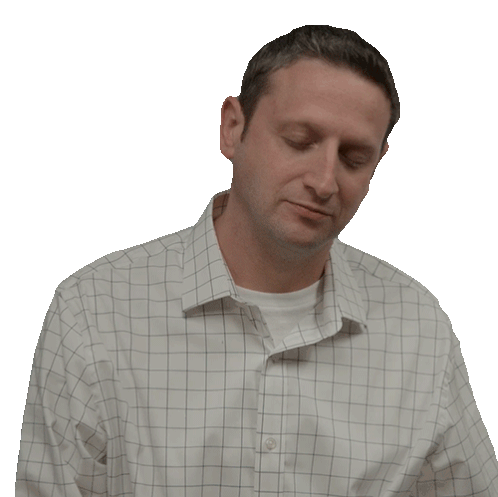 Tim Robinson expresses disapproval and denial, shaking his head and holding his temples in frustration.