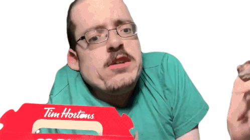 Ricky Berwick makes a 'No What?' face while eating a donut from a Tim Hortons box.