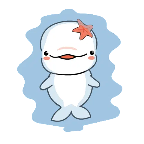 A cute white whale-like creature with a starfish on its head shushes with a seashell, shedding a tear, indicating a secret or sadness.
